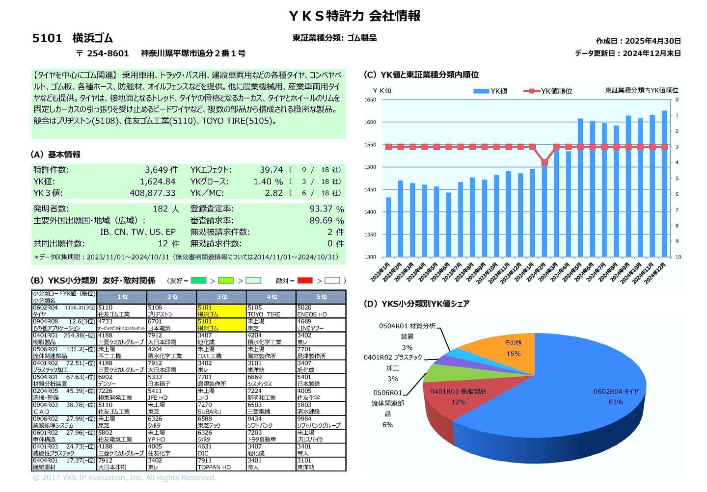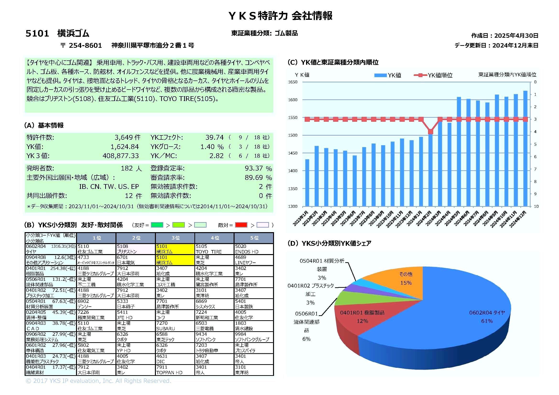 Nikkei225および特許競争力指標「YK値」上位企業(計約400社)について、特許統計情報をコンパクトにまとめました。最新動向コメント、「YK値」などの指標、発明者数や主要海外出願国、業界内での競争関係などを掲載しています。