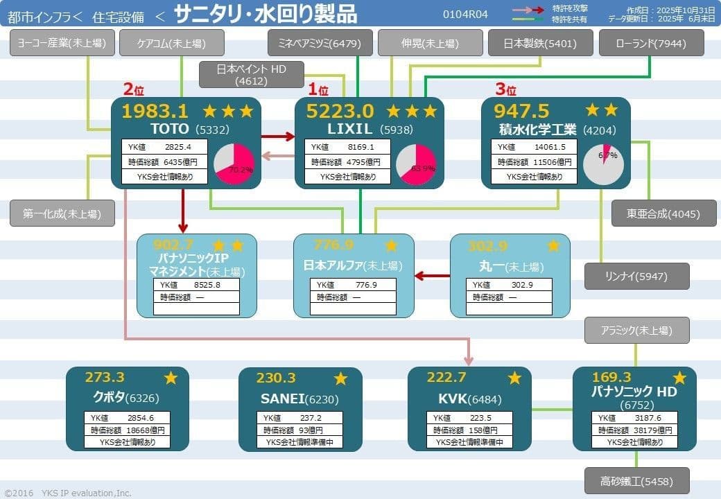 YKS技術業種分類ごとに、企業の特許競争力や技術面での競合関係、協力関係をマップとして表現しています。2ページ目には特許競争力の長期動向(折れ線グラフ)や分布(円グラフ)も収録。各業種の企業間の技術協力・敵対関係とトレンドを概観できます。