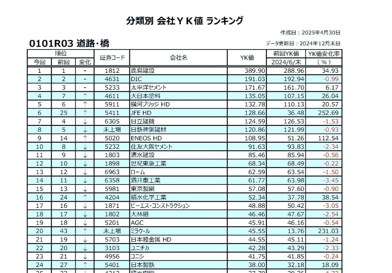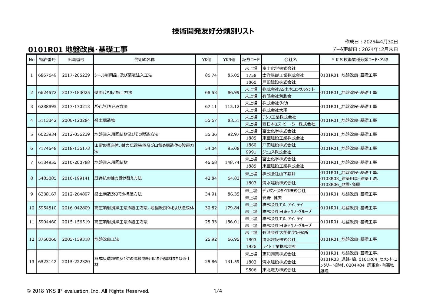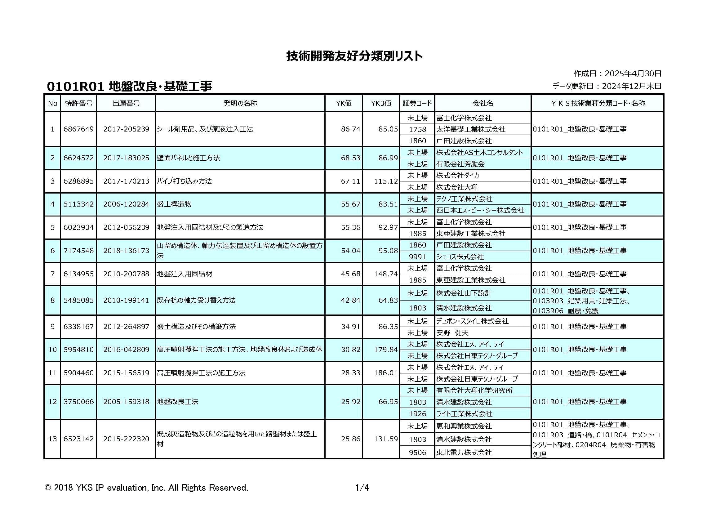 YKS技術業種分類ごとに、企業を特許競争力指標「 YK値」でランキング。 YK値の上昇率・下落率による企業ランキングも合わせて収録しています。