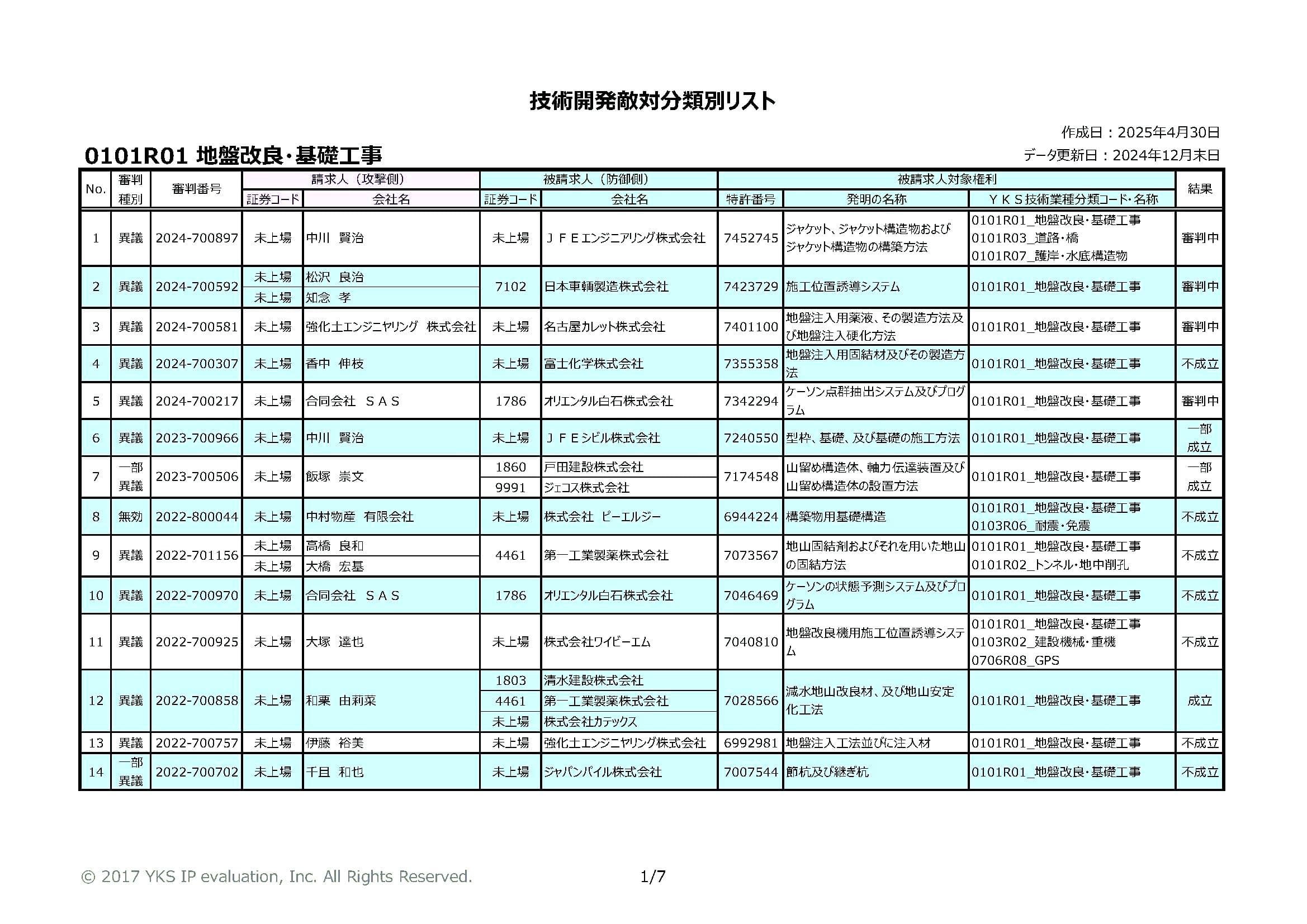 YKS技術業種分類ごとに、複数の企業による共有特許をリスト化 しました。特許競争力指標「 YK値」が高い 50特許までを 掲載しています。