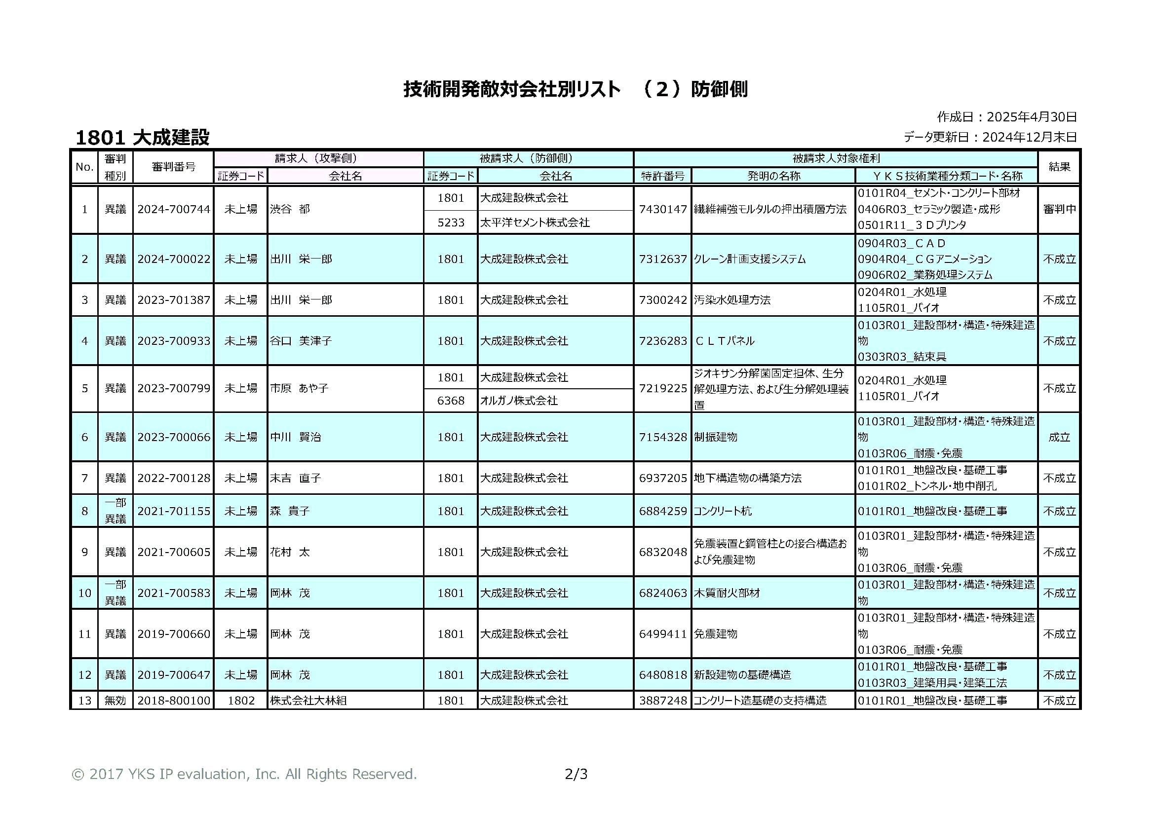 特許競争力指標「 YK値」上位企業(約 300社)について、敵対関係(無効審判、異議申立)にある特許をリスト化しました。