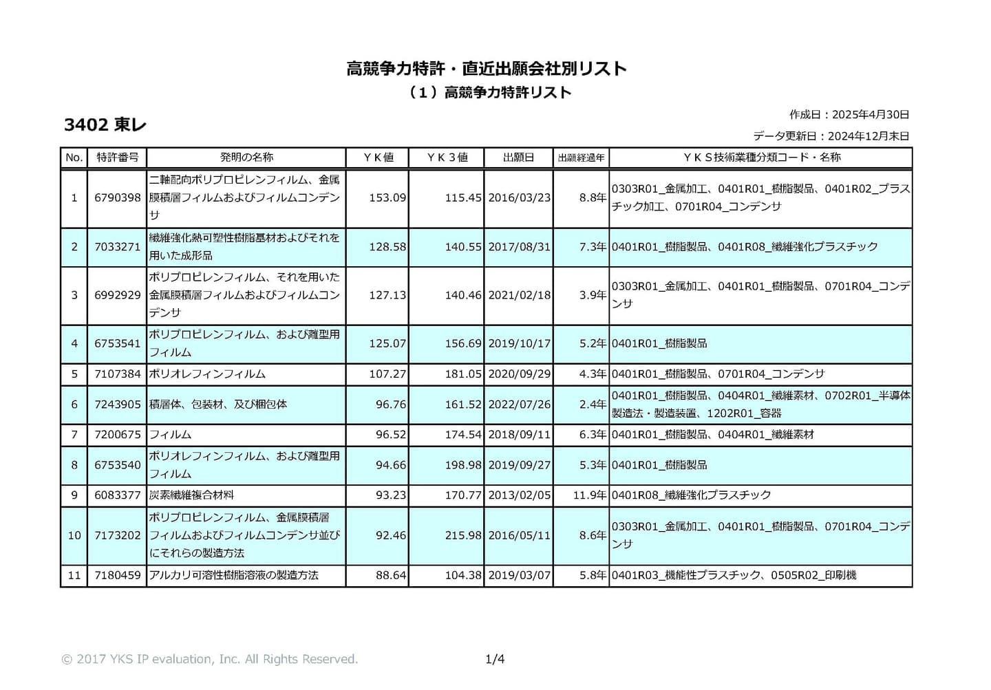 特許競争力「 YK値」上位企業(約 300社)について、特許競争力指標「 YK値」の高い特許をリスト化しました。直近に出願した特許一覧も合わせて掲載されています。